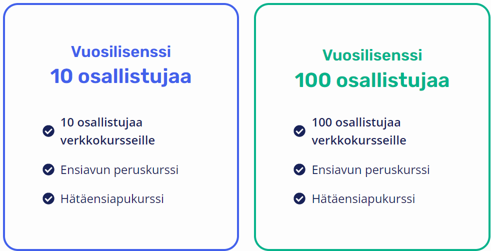 Valitse yrityksellesi sopiva vuosilisenssi. Vuosilisenssimme sisรคltรคvรคt aina kaikki ensiapukurssit.